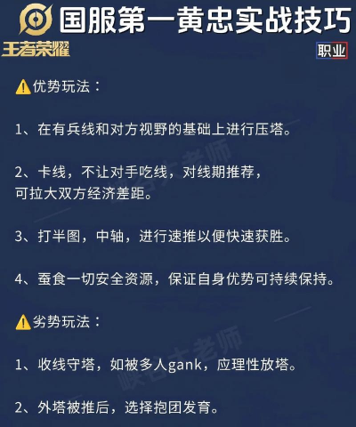 玩黄忠,先得懂技能,他的被动,普攻能叠加暴击率,所以,对线时要多A兵,一技能是加速,用来追人,或者逃跑,二技能放地雷,能获得视野,还能破甲,大招架炮台,范围超远,但自己不能动,这是核心,也是弱点。
