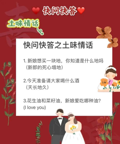 敲红包游戏,核心是互动,新郎来接亲时,伴娘拿出红包,但不会直接给,需要完成小任务,才能拿到红包,任务可以很简单,比如唱首歌,或者说情话,也可以有点难度,比如做俯卧撑,或者回答问题,任务由伴娘设定,红包就藏在附近,找到才算成功。