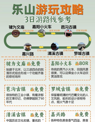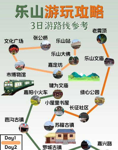 如果时间紧,一天也能玩,上午去看大佛,下午去市区吃美食,如果时间充裕,建议玩两天,第一天专心看大佛,慢慢走,好好感受,第二天再去苏稽古镇,或者峨眉山脚下转转,这样不会太累,玩得也更深入。