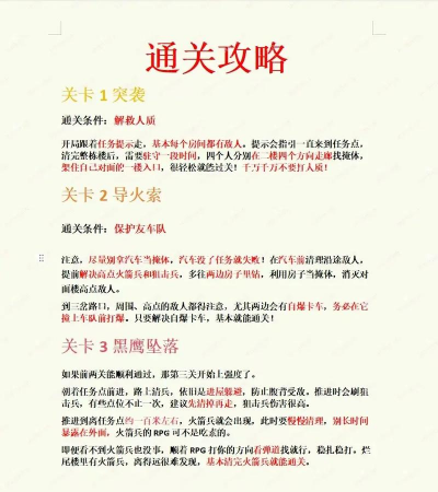 有几个关卡确实难,比如防守广场那关,敌人会从四面八方来,优先打掉火箭筒兵,他们威胁最大,然后清理机枪点,占领制高点,能获得很大优势,另一关是夜间潜入,要多用夜视仪,走路慢一点,避开探照灯,被发现了就赶紧跑,重新找路线,多试几次,熟悉敌人巡逻路线,就能过去。