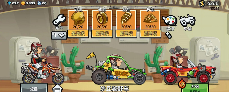 沙丘全是高低起伏的坡,上坡前要蓄力,下坡时要小心,上坡时,提前一点加速,借助惯性冲上去,如果坡太陡,冲不上去也别硬来,退下来重新找角度,下坡时更要稳住,别让车子飞得太高,落地容易翻车。