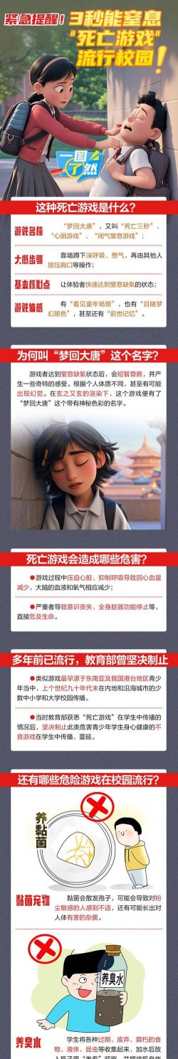 先看窒息游戏,这个很危险,有些青少年,会尝试憋气,或者互相勒颈,他们觉得,这样很刺激,但你知道吗,大脑缺氧,几分钟就致命,每年都有,因此丧命的案例,所以,千万别尝试。