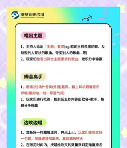 要选好主题,比如唱带“爱”字的歌,或者只唱老歌,定好规则大家才明白,然后决定谁先唱,可以猜拳,也可以转瓶子,第一个人唱完一句,下一个人要接上,歌词必须相关,或者押韵也行。