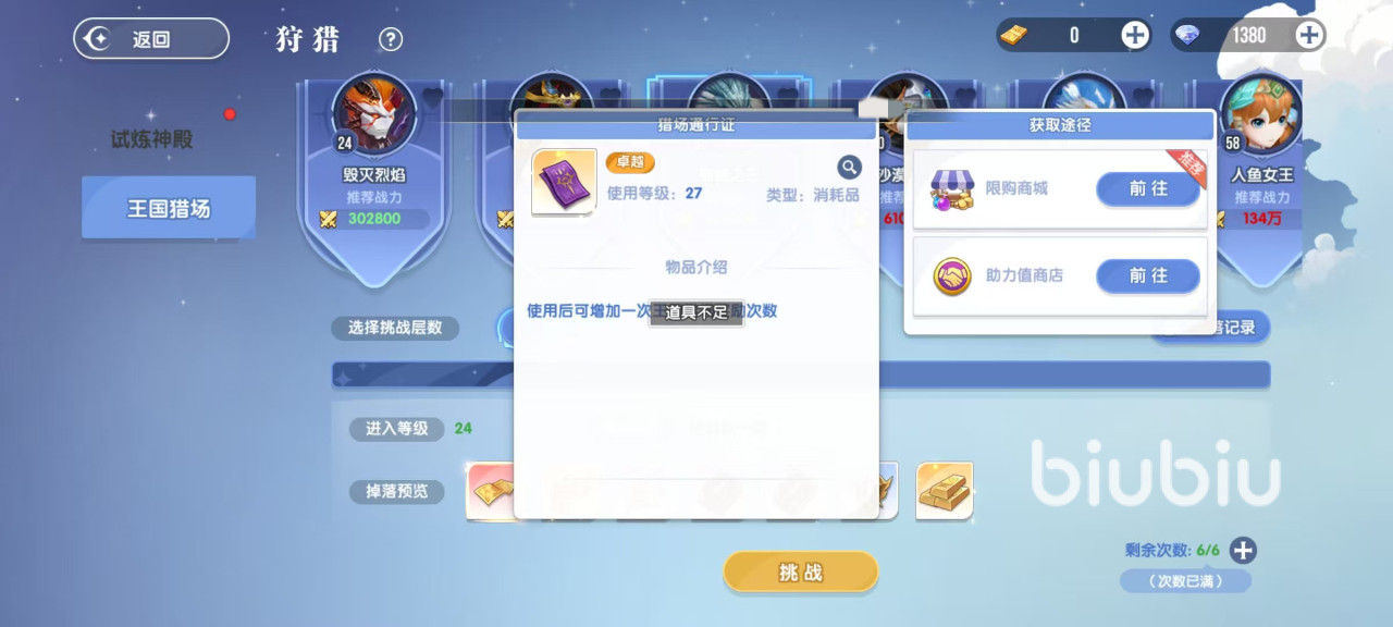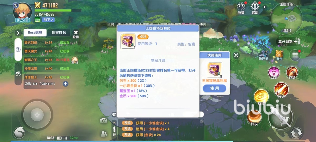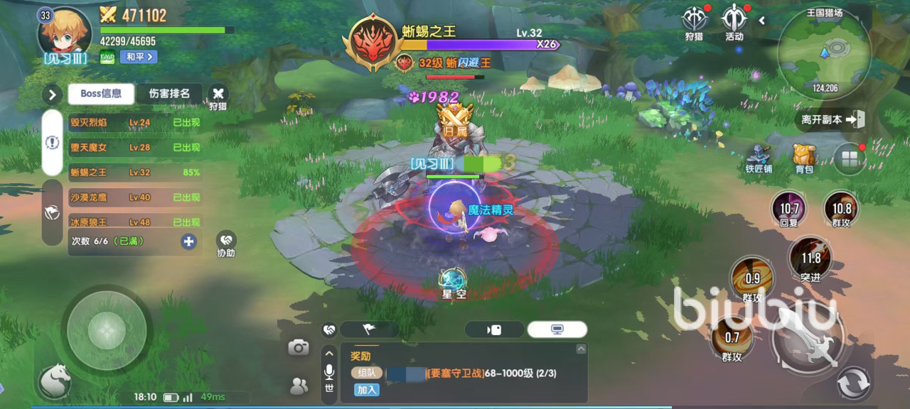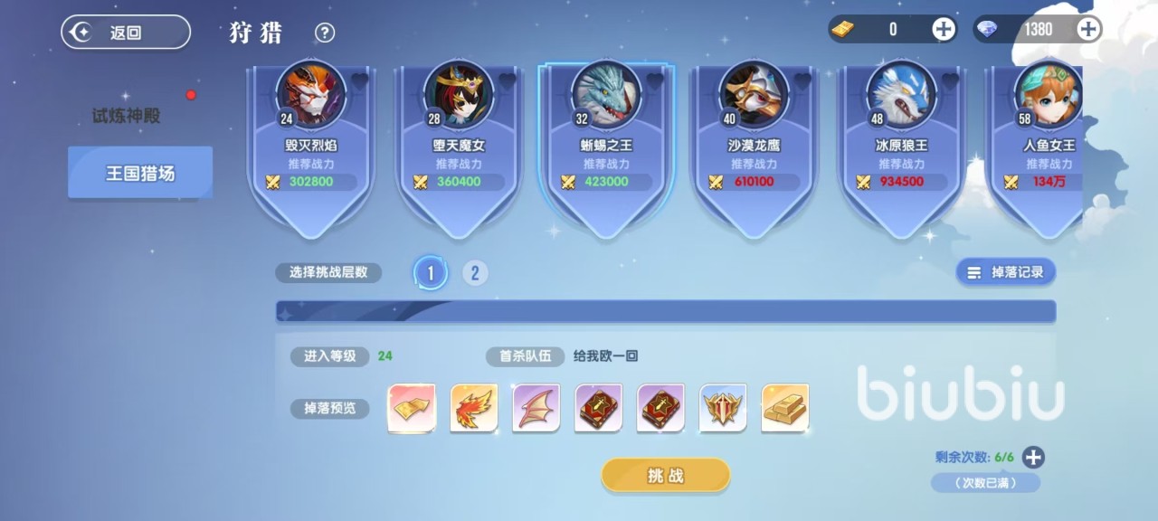 在主界面中点击活动,日常活动中就可以直接看到王国猎场,这里面有多个不同的BOSS,有相应的战力要求,按照推荐战力去选就是了。选择好之后直接点击挑战,就能够进入其中自动战斗。排名前三的玩家或队伍可获得奖励,伤害排名第一的玩家或队伍,可拿到额外奖励。在王国猎场内还会随机刷新一些比较稀有的BOSS,击杀奖励更加丰厚。随着世界等级变化,在低层次即将不会刷新出稀有BOSS,所以大家一定要努力挑战更高层。在这项活动中还可以使用道具将已经死亡的boss复活过来继续击杀。每天会提供6次免费次数,可通过消耗通行证来增加次数。