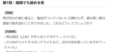 比如,出题人说,一个男人走进酒吧,然后突然死了,为什么,这时,你就可以开始猜了,你可以问,他是被谋杀的吗,出题人回答,不是,你再问,他是自杀的吗,出题人可能说,也不是,那么,线索就要往别处想了,是不是酒吧里有危险,或者,他本身就有疾病,通过一个个问题,大家慢慢拼凑出真相,这个过程,就像在喝一碗汤,你要一勺一勺地,把里面的“料”都捞出来。
