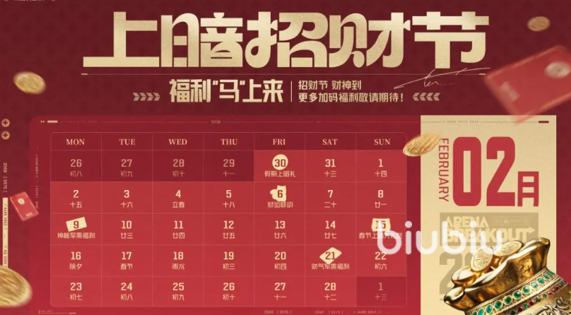 在2.6起会有财运联动、马年独有的大金,2.9起会有神秘感拉满的军需福利,2.15开始有春节大礼包,能免费获取到限定大金礼盒、装扮卷、套装和枪械的涂装等,2.21大家能拿到财气军需福利。