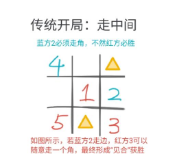 开局时,最好抢占中心格,因为中心位置最灵活,可以连接四个方向,如果中心被占,那就选角落,角落能形成两条连线,比边线位置更有优势,记住,别轻易走边线,除非迫不得已。