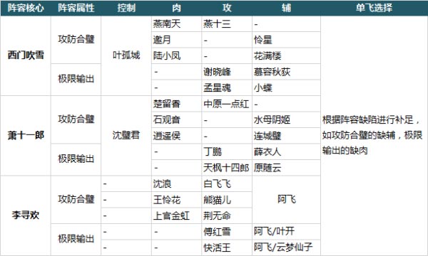 单飞这个弟子一定是和阵容弟子有缘分的,且可以弥补阵容缺陷的,这个可以根据自己对阵容搭配的理解来确定用哪个。比如2对合璧都是输出,那单飞就可以考虑是个肉;2对合璧都是群攻,单飞就可以考虑单攻等等。