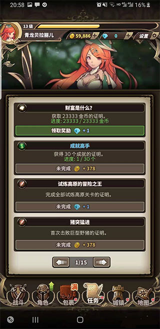 除此之外我们还有任务系统,在任务系统界面可以看到所有的任务,不过不能一件自动完成,一般都是通关类的,只需要完成对应的关卡就可以获得任务奖励了,还是比较简单的。