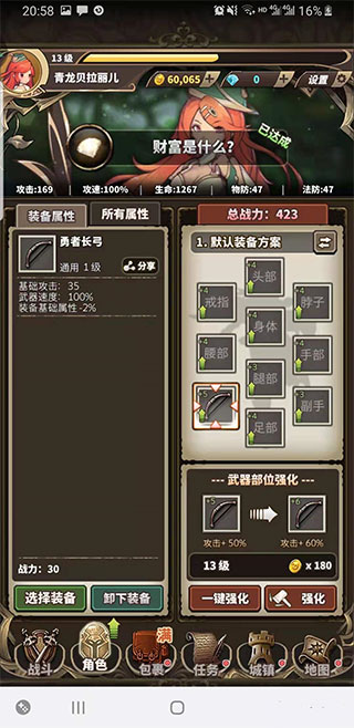 不过高级的技能还是需要的一定的等级要求,学习了技能之后需要注意一个更换,同时在我们的角色选项中是由装备强化功能的,这个越到后期越关键,前期的话金币不是很够可以暂时放一下。