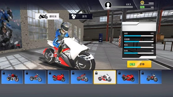 1、玩家进入游戏后,能从车库里挑选初始摩托车去参加初级赛事,通过赢得比赛获得的奖励金币,可以用来购买性能更出色的机车,或者给现有的配件进行升级。