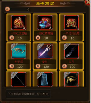 商店出售各阶红装、红装碎片、装备宝箱(包括4中武器、3种防具、4种饰品),可以使用巅峰币购买,巅峰商店每日21点刷新,不可手动刷新。
