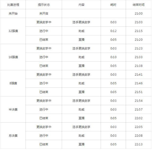 5.每轮比赛开始前均有2分钟的更换武学时间,然后进入1分钟等待时间。