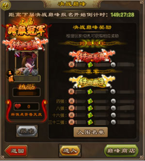 点击进入“决战巅峰”界面后,大侠们可以在本界面获得下届“决战巅峰”报名时间、上届冠军、各个名次奖励内容等信息,除此之外我们还能看到报名、入围名单、进入、巅峰商店等按钮。