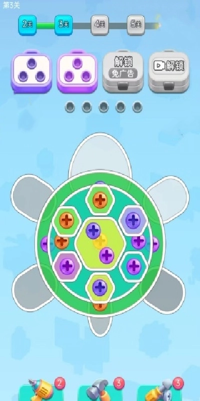 3、游戏后续关卡会设置锁链、固定螺丝一类的障碍,玩家需要先处理掉这些障碍螺丝,才能拓展可操作的空间。