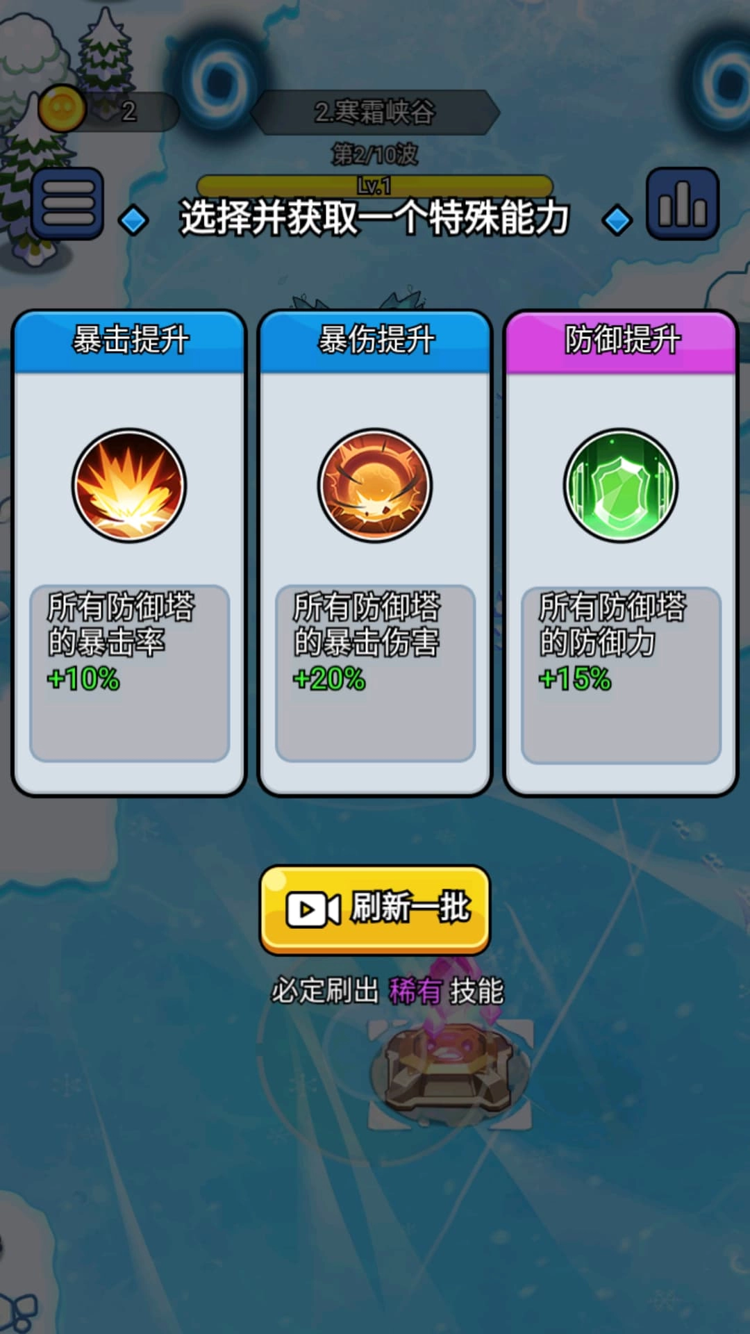 3、解锁寒霜峡谷等不同主题的关卡,根据地形特点调整布防策略,顺利通过关卡。