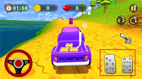 3.玩家能够借助虚拟按键或者重力感应来操控卡车的油门、刹车、转向,还有在空中时对车身姿态进行调整。
