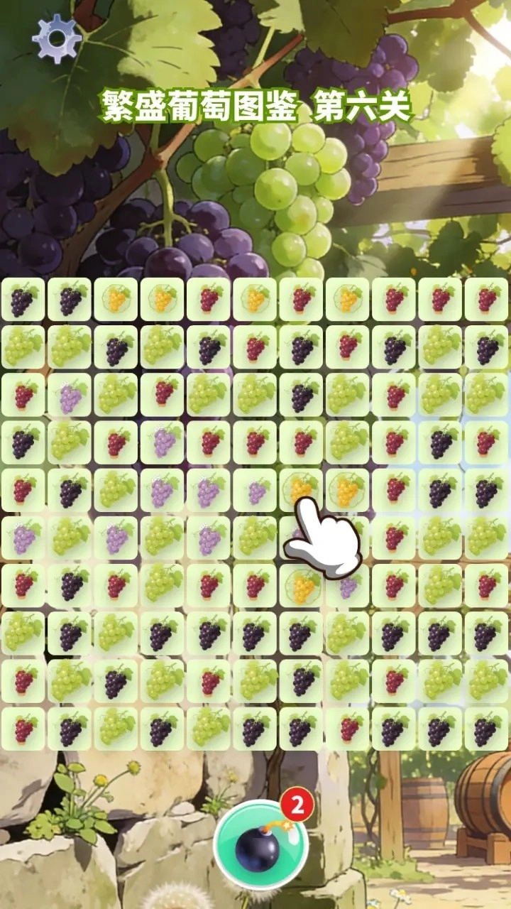 1、需在屏幕上点击并拖动葡萄方块,通过滑动操作完成葡萄匹配,达成消除条件,触发消除效果,推进关卡进程。