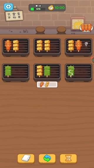 2、按住烤串进行选中并移动,把相同种类的烤串凑成三个及以上,就能触发消除打包的效果,从而空出烤架的空间。