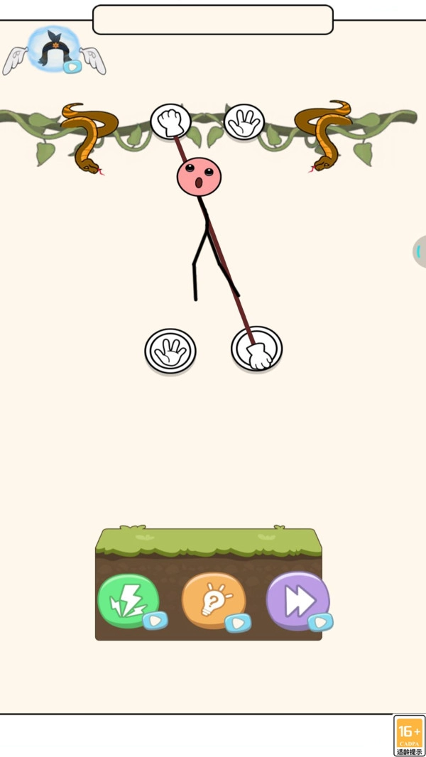 2、长按屏幕可调节手臂的拉伸长度与角度,松开后火柴人会借助摆荡的力量,只有精准计算才能跨越复杂地形。