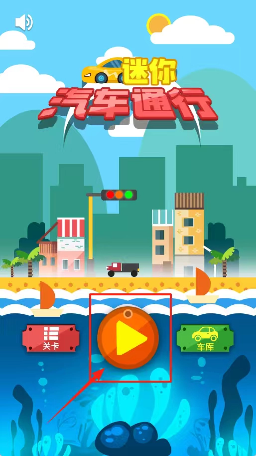 1、点击橙色播放按钮启动,通过红色按钮选择关卡,绿色按钮能进入车库查看或解锁车辆,先熟悉核心功能的入口位置。