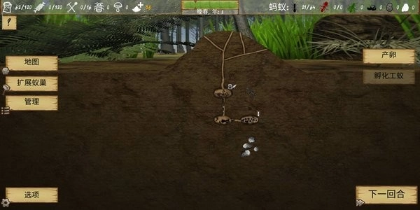 作为一款融合了生存与建筑元素的回合制策略游戏,其世界场景均为随机生成,这意味着每一次游戏都将带来截然不同的挑战。你的终极目标是将这个小小的蚁巢逐步发展壮大,最终建立起一个庞大的蚂蚁帝国,让蚂蚁的领地遍布整个世界。