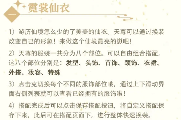 2、天尊的服装总共包含八个可自由组合搭配的部位,具体为:发型、头饰、首饰、颈饰、衣裙、外搭、妆容与特殊。