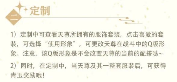 1、在定制界面中,你可以查看天尊已拥有的服饰套装,点击你喜欢的套装后,选择“使用形象”选项,就能更换天尊在战斗时的Q版外观。需要注意的是,这个Q版形象的更换并不会影响天尊当前实际的装备搭配哦~