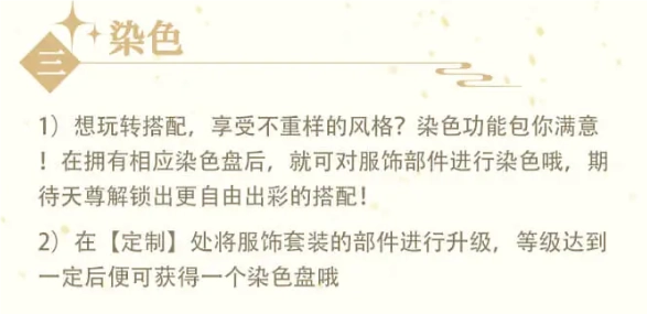 1、想轻松玩转搭配,每天都能拥有不重样的风格?染色功能绝对能让你满意!只要拥有对应的染色盘,就能对服饰部件进行染色啦,期待天尊解锁出更自由、更出彩的搭配!