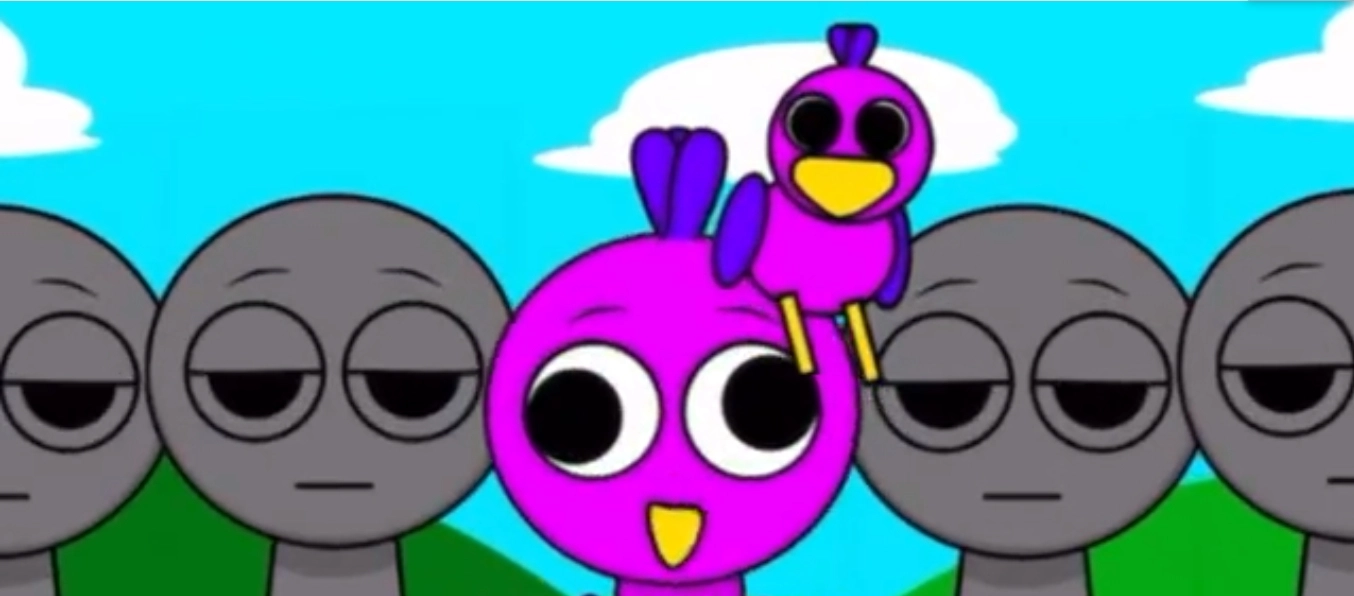 这是我们的双面人杰夫特,旁边还有一只蓝色的小鸟——之前出现的是粉色的那只,而这只蓝色的正好对应我们原版里的蓝色天空(sky)。