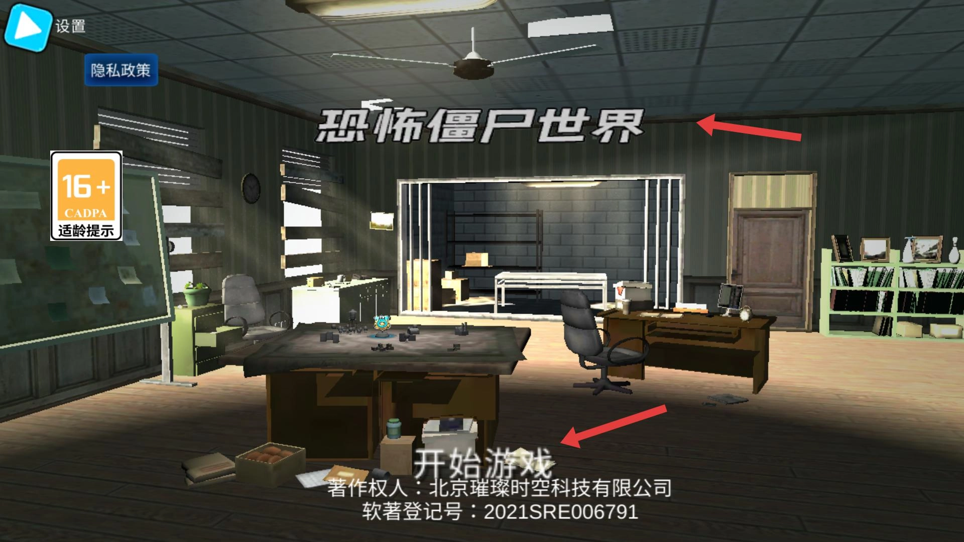 1、初始界面呈现出室内场景,界面上有“开始”字样,点击该字样即可进入遍布僵尸的世界,开启冒险之旅。