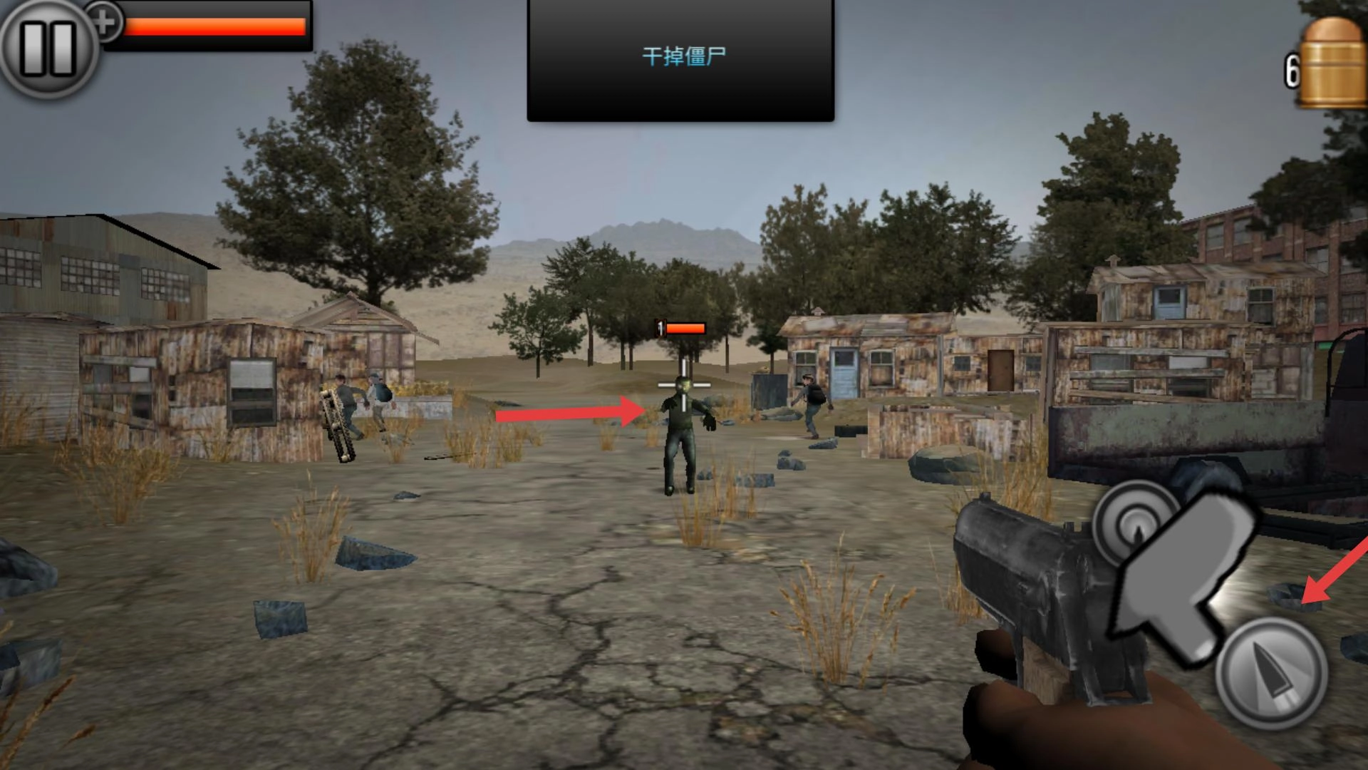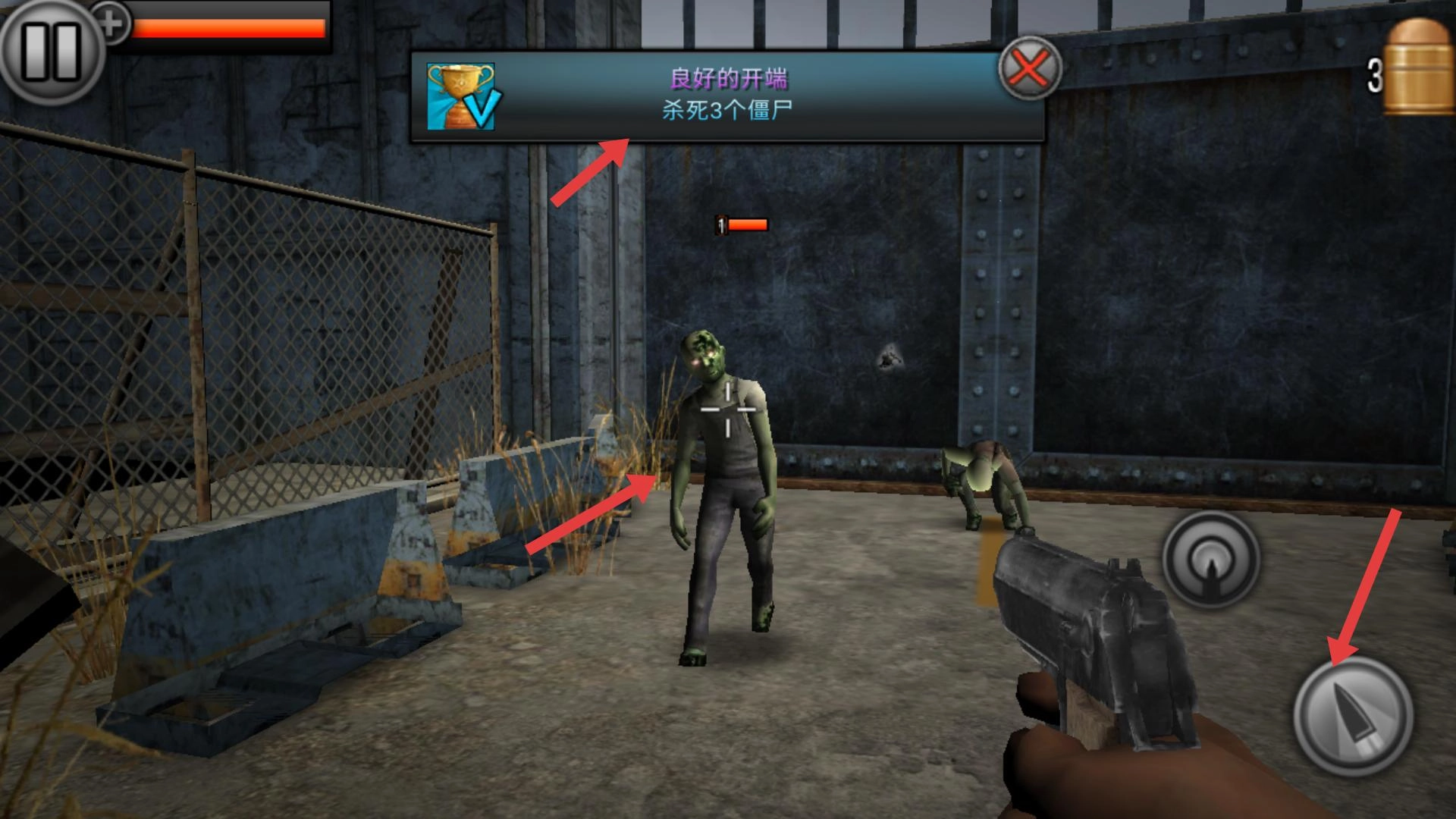 2、进入游戏后,会触发消灭僵尸的任务,这时需要操控角色,使用武器瞄准并射击前方的僵尸,开启战斗。