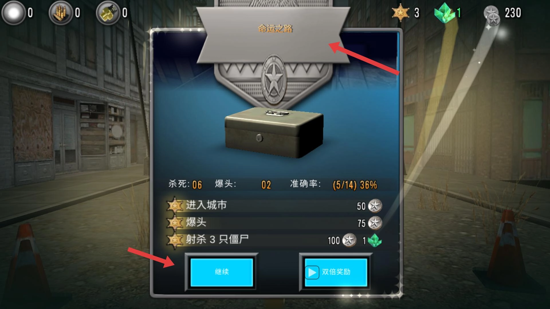 4、当命运之路的结算界面出现时,会展示击杀僵尸的数量、爆头数等数据,点击“继续”按钮即可开启下一段冒险。