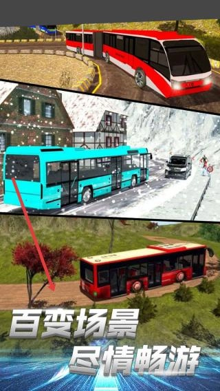 2、开启“百变场景”模式,驾驶巴士挑战山路、雪地等多样地形,通过虚拟按键操控方向与油门,以适应不同的路况条件。