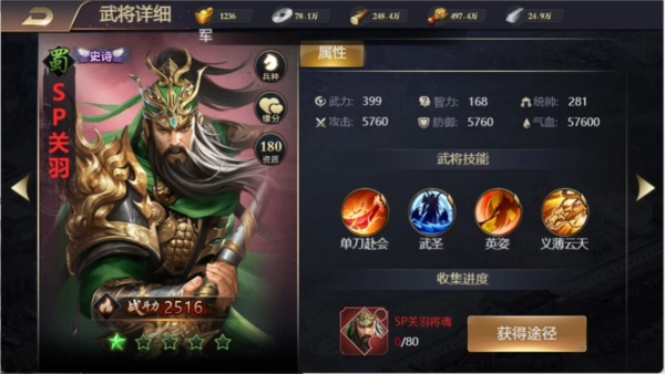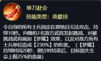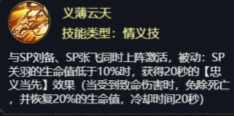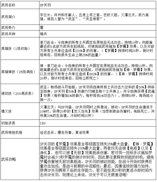●武将攻略:SP关羽的[梦魇]效果为全等级固定损失25%最大血量,[神·梦魇]效果则是全等级固定损失100%最大血量。这两种效果均无法被[免疫]和[净化]抵御,但能被[无敌]效果抵消伤害。需要注意的是,若对同一目标多次施加梦魇,会减少3秒梦魇的倒计时时间,所以要把控好技能释放时机,防止梦魇伤害被无敌效果抵消。SP关羽的被动技能会在战斗开场时为其提供巨量攻击加成,是战斗前期的核心输出点;此外,情谊技的强力加持让SP关羽具备不错的生存能力,要是不能在其20秒的复活冷却时间内将其击杀,理论上SP关羽可以实现无限复活!