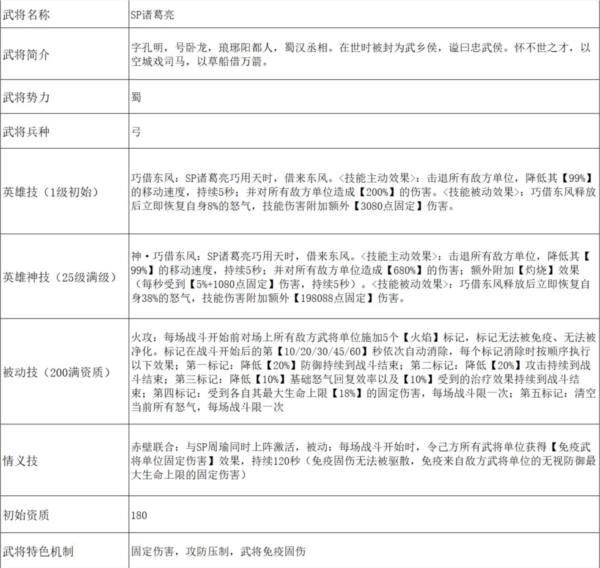 神·巧借东风:SP诸葛亮善用天时,借来东风。:击退所有敌方单位,使其移动速度降低【99%】,持续5秒;同时对所有敌方单位造成【680%】的伤害;额外附加【灼烧】效果(每秒受到【5%+1080点固定】伤害,持续5秒)。:巧借东风释放后,立即恢复自身38%的怒气,技能伤害额外附加【198088点固定】伤害。