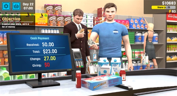超市管理模拟器是一款简单有趣的超市模拟经营类游戏。在这款版本中,你将化身超市经理,根据顾客的需求上架各类商品,通过满足他们的需求来赚取更多收益。