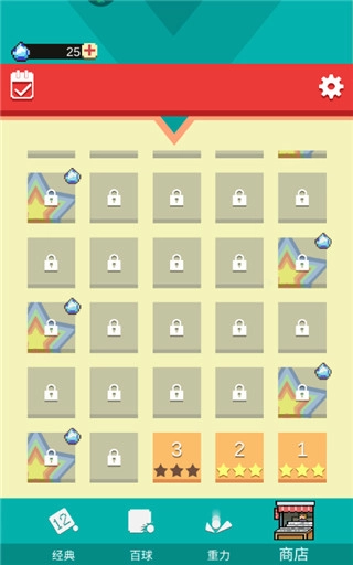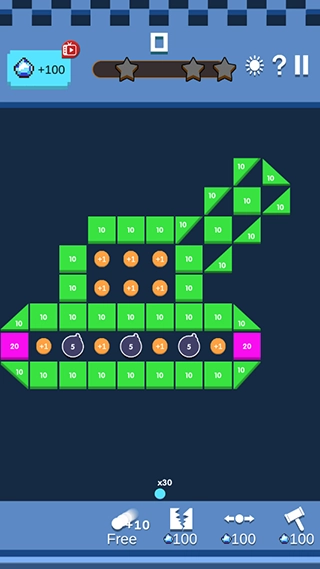 滑动屏幕瞄准目标,系统会自动发射弹珠。只有消除所有砖块,才能获取分数与星星。