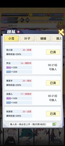 4、团队中优先使用钻石来升级能提升赚钱百分比的成员(建议每次都用钻石保底,要将其升满需要花费较长时间)