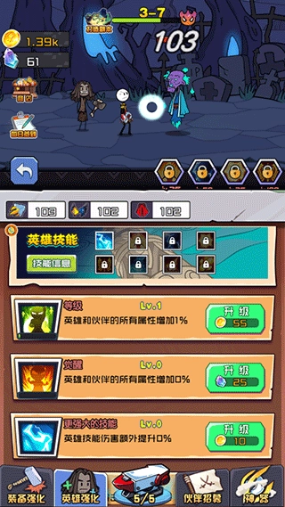 4、点击“英雄强化”功能,可提升主角等级并解锁新技能。