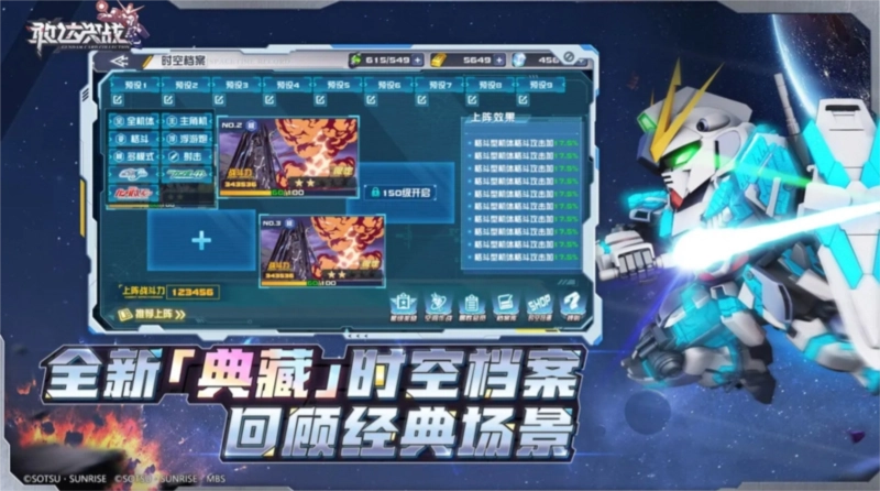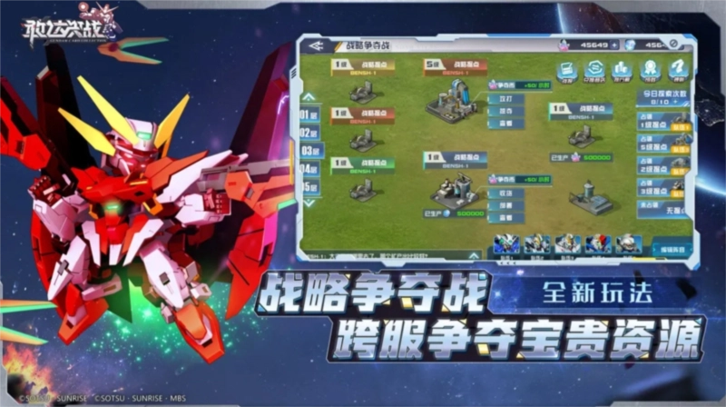 所有剧情与角色设计均围绕原著机体和机师展开,完全忠于敢达系列的创作内核,延续热血的敢达世界观,真实还原经典战斗场景,再度点燃动画迷对机动战士的热情。在这款游戏的战斗过程中,玩家可根据战场实时情况,随时调整作战策略与布局,精准把控队长技能的释放时机,于枪林弹雨中运筹帷幄,在战火纷飞间从容应对,尽情享受机动战士的热血战斗体验。游戏的核心玩法是收集高达、升级高达,再用已收集的高达参与对战;高达的收集与升级可通过扭蛋抽取或通关任务获取。此外,玩家还能通过碎片兑换、公会玩法、竞技场奖励、机师挑战赛兑换等多种途径获取资源,游戏中更设有多处平民可兑换机体的渠道,以极致品质带领玩家充分感受宇宙战争的战斗快感。