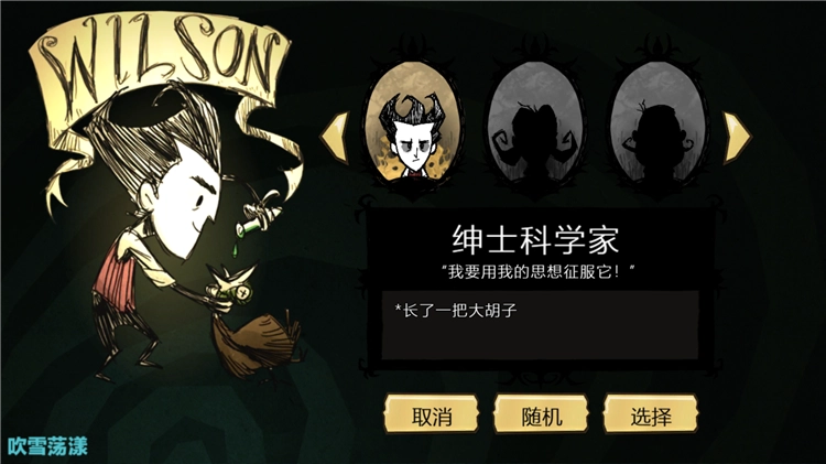 威尔逊唯一的特殊能力是他的胡须会定时变得茂密。作为基础角色,他的生命值、理智值和饥饿值都处于预设水平,并且没有任何缺点。总体而言,威尔逊在冬天比其他角色更具优势,也更容易制作复活肖像,他均衡且不错的属性让玩家认为他是最容易上手的角色之一。