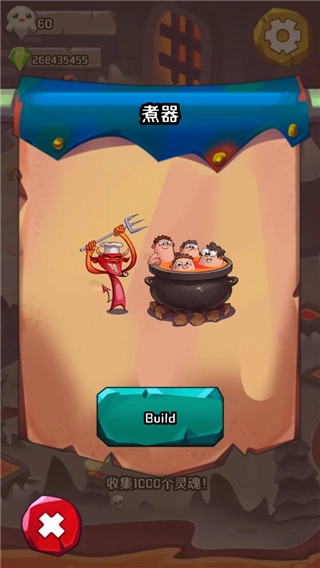 《地狱英雄》是一款以地狱为背景的放置类游戏,画面风格卡通可爱。进入游戏后,点击空地即可开始建造并装备空间;滑动屏幕能收集灵魂,初期目标是先收集20个灵魂。