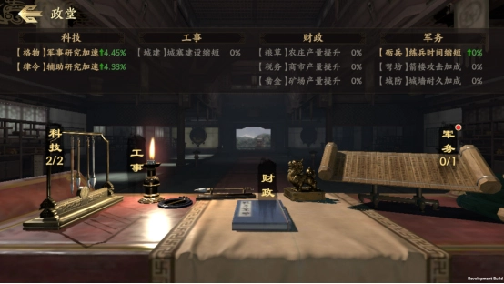 官府处理政务的地方,主公可以去政堂,通过任命武将处理城中政务,获取各类加成。能任命的官职类型,会随着政堂等级的提升而解锁,政堂等级越高,解锁的官职类型就越多样,任命武将后得到的加成也会更多。