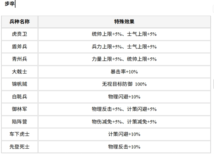 1、武将兵种-步卒:作为基础近战兵种,步卒血量厚实、防御较高,是战场前排的中坚力量,擅长承受伤害并向前推进,为后排部队提供保护,适配各类常规作战阵容,是新手前期的核心兵种选择。