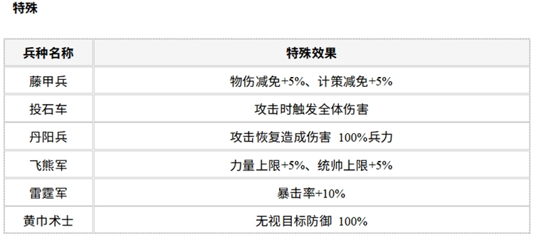 4、武将兵种-特殊:这类稀有兵种具备专属技能与独特战斗特性,集功能性与战斗力于一体,适配各类个性化战术体系,解锁后可显著增强阵容的多样性并提升作战上限。