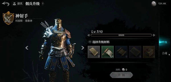 金卡分为普通金卡佣兵和神选金卡佣兵两类。普通金卡的角色都是路人脸,能从绿卡逐步升阶到金卡;神选金卡一般得通过卡池抽取、兑换或活动赠送等途径获取(只有两名神选主角比较特殊,能随着剧情推进升阶到金卡)。神选金卡通常有着更出色、实用的技能,还具备能给战场友军带来额外增益的神选光环,而且只有神选金卡后续才能进行浸化和沐化阶段的突破。神选角色暂且不展开细说,我们把重点放在普通金卡上。合成普通金卡时,除了需要本体,1张同类别绿卡加上绿色胸章能合成1张蓝卡,4张蓝卡加上1个蓝色胸章能合成1张紫卡,3张紫卡加上1个紫色胸章能合成1张金卡。一般来说,零氪或者微氪玩家,正常用产出的资源抽卡池,再加上各种奖励,在主线推进到7章左右时,完全可以通过合成得到1到2名普通金卡。这里再强调一下:解锁每日限定次数的落难者墓园后,每天也要记得花点时间去刷一下,这里能稳定获取低阶职业突破所需的狗粮。后续培养金卡和神选角色,对同名基础佣兵的需求消耗还是挺大的。