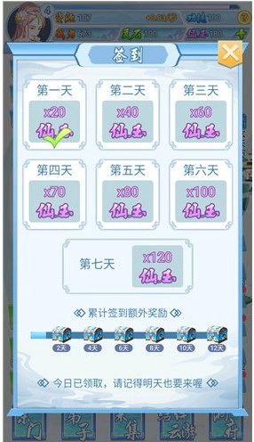 首先是签到奖励,这是平民玩家获取仙玉的重要方式,玩家签到时能得到一定数量的仙玉,签到奖励通常七天重置一次,大家记得每天签到,别忘记了。
