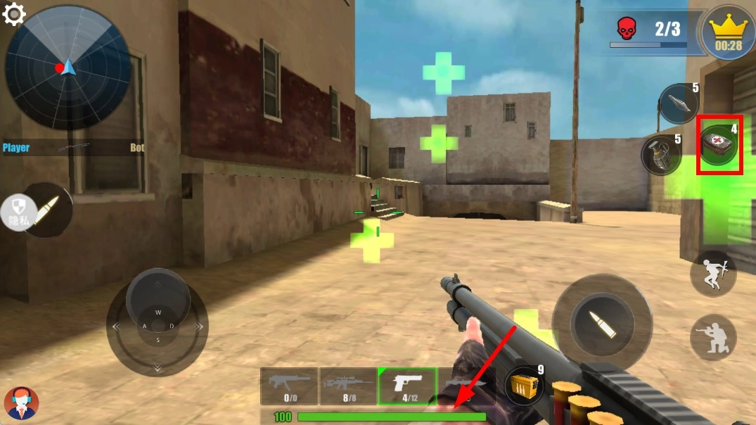 4、当角色生命值下降时,点击右侧的医疗包图标,即可恢复角色的生命值,使角色能够继续在场景中与敌人战斗,进而完成关卡目标。