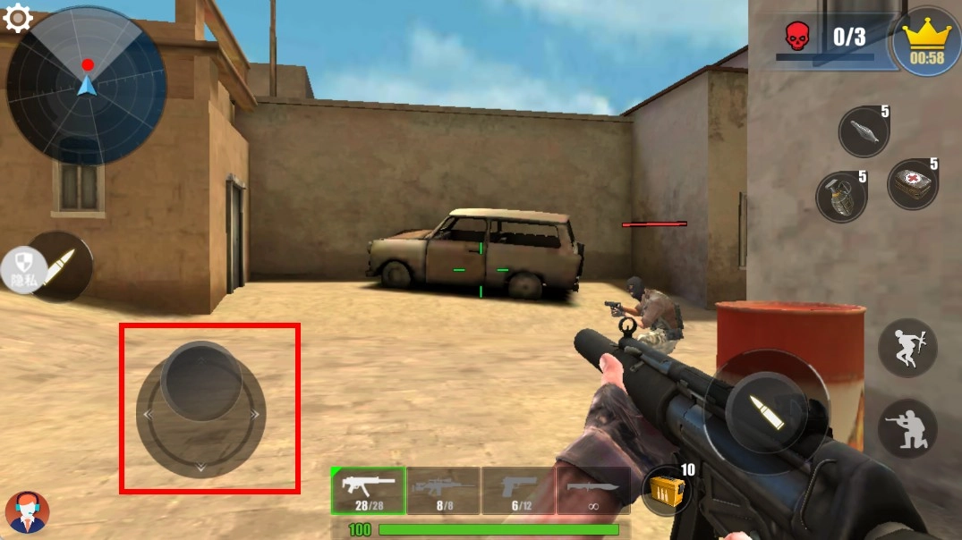 2、战斗场景中,玩家可借助左侧的虚拟摇杆,操控角色在包含车辆与建筑的区域内移动,以此搜寻敌人的方位,为发起攻击做好准备。